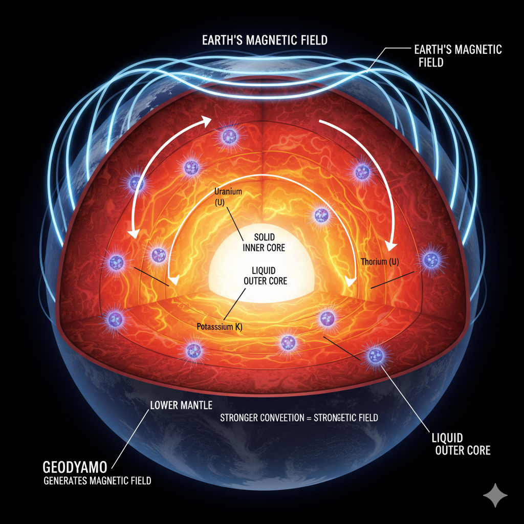 In theory, adding radioactive isotopes to our earths core can help strengthen the Earth’s core’s and its ability to generate a stronger magnetic field. However, this is a theoretical idea