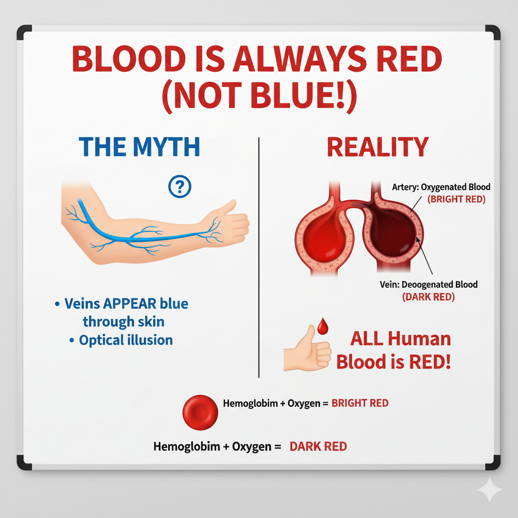 That’s a myth. Human blood is always red, and it does not turn red when it hits the air. The misconception that blood is blue inside the body and only